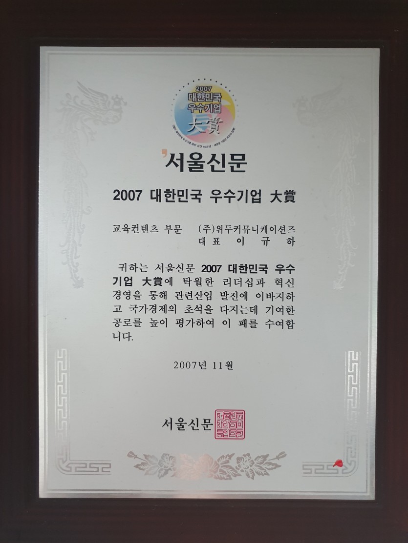 2007 대한민국 우수기업 대상 페이지 정보 작성자 WeDu 댓글 0건 조회 4,983회 작성일 19-05-30 19:31 본문 2007-11-00 대상 교육 콘텐츠 부문 2007 대한민국 우수기업 대상 서울신문 List Previous제 8회 디지털 이노베이션 대상 19.05.30