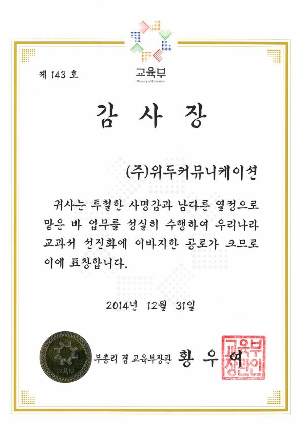 감사장 제 143호 페이지 정보 작성자 WeDu 댓글 0건 조회 4,970회 작성일 19-05-30 19:33 본문 2014-12-31 감사장 제 143호 교과서 선진화 부총리 겸 교육부장관 황우여 List Previous산업통상자원부 표창장 19.05.30 Next한국여성벤처협회 표창장 19.05.30