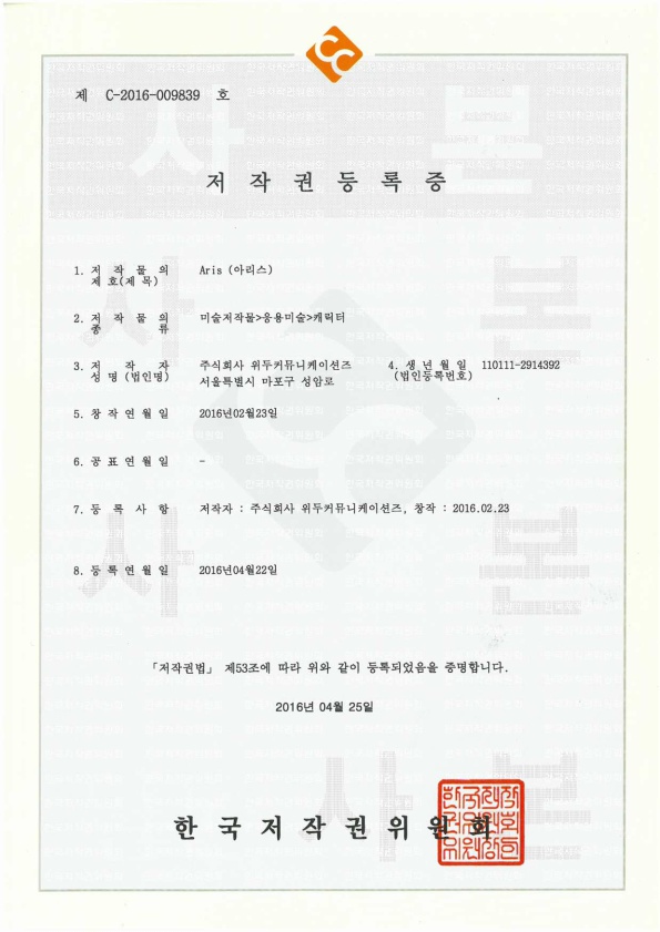 [한국/저작권] 아리스 페이지 정보 작성자 WeDu 댓글 0건 조회 5,228회 작성일 19-05-30 19:09 본문 2016-04-22 저작권 C-2016-009839 아리스 / 미술저작물>응용미술>캐릭터 List Previous[한국/저작권] 필립 19.05.30 Next[한국/저작권] 리안 19.05.30